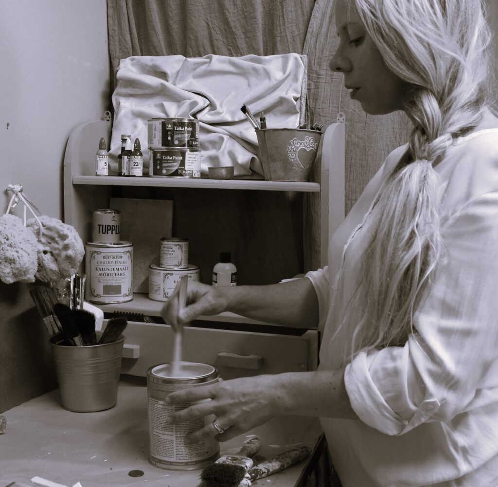 Koulutuksen aikana innostukseni suunnittelutyöhön ja erityisesti kalustemaalaukseen syveni entisestään. Opettelin monipuolisesti erilaisia pintakäsittely- ja erikoistekniikoita ja aloin pohtia, voisiko tällaiselle käsityölähtöiselle tekemiselle olla paikkansa kodeissa, joissa halutaan uudistaa maltilla ja kunnioittaa olemassa olevaa.